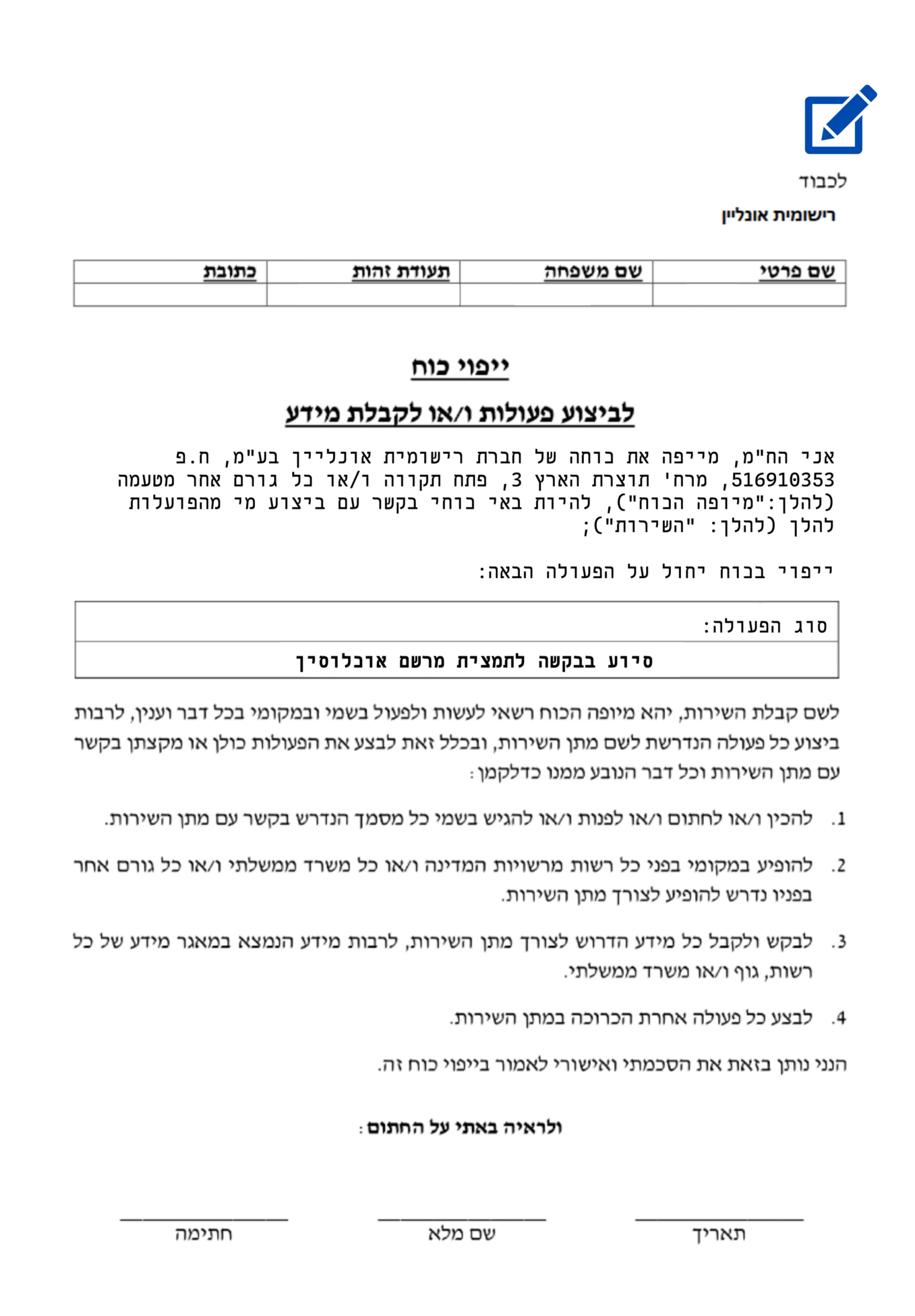 • טיפול משפטי המסמך נדרש במקרים רבים להגשת בקשות לבית המשפט או לביצוע פעולות משפטיות אחרות.